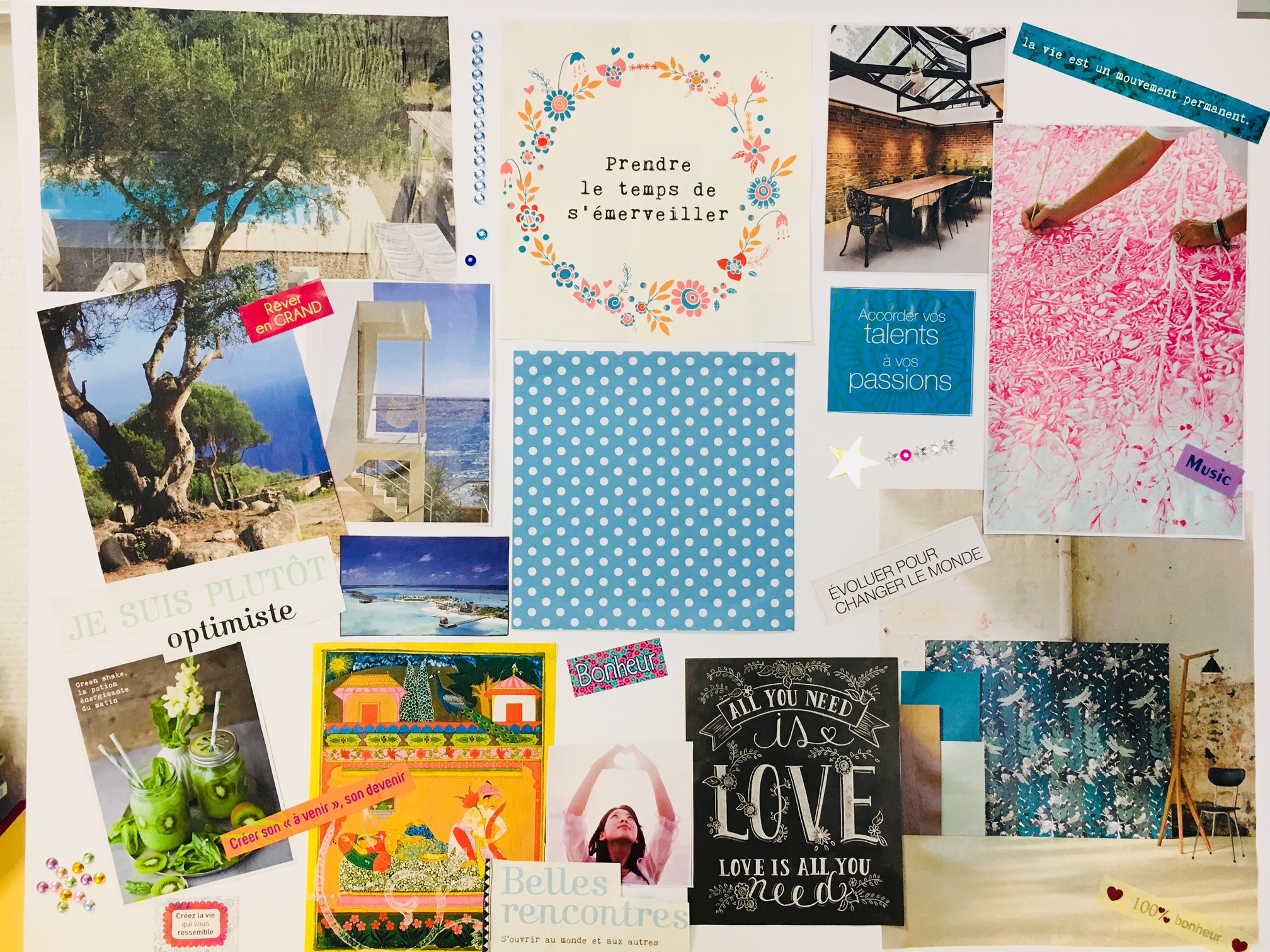 L’atelier se déroule sur une journée, en petit groupe. Je vous guide pour mettre en évidence vos désirs profonds, vous aider à visualiser votre vie rêvée en créant sur un panneau, grâce à des photos de magazines, des titres inspirants, des autocollants… votre Tableau de Vie que vous rapportez chez vous en fin de journée.